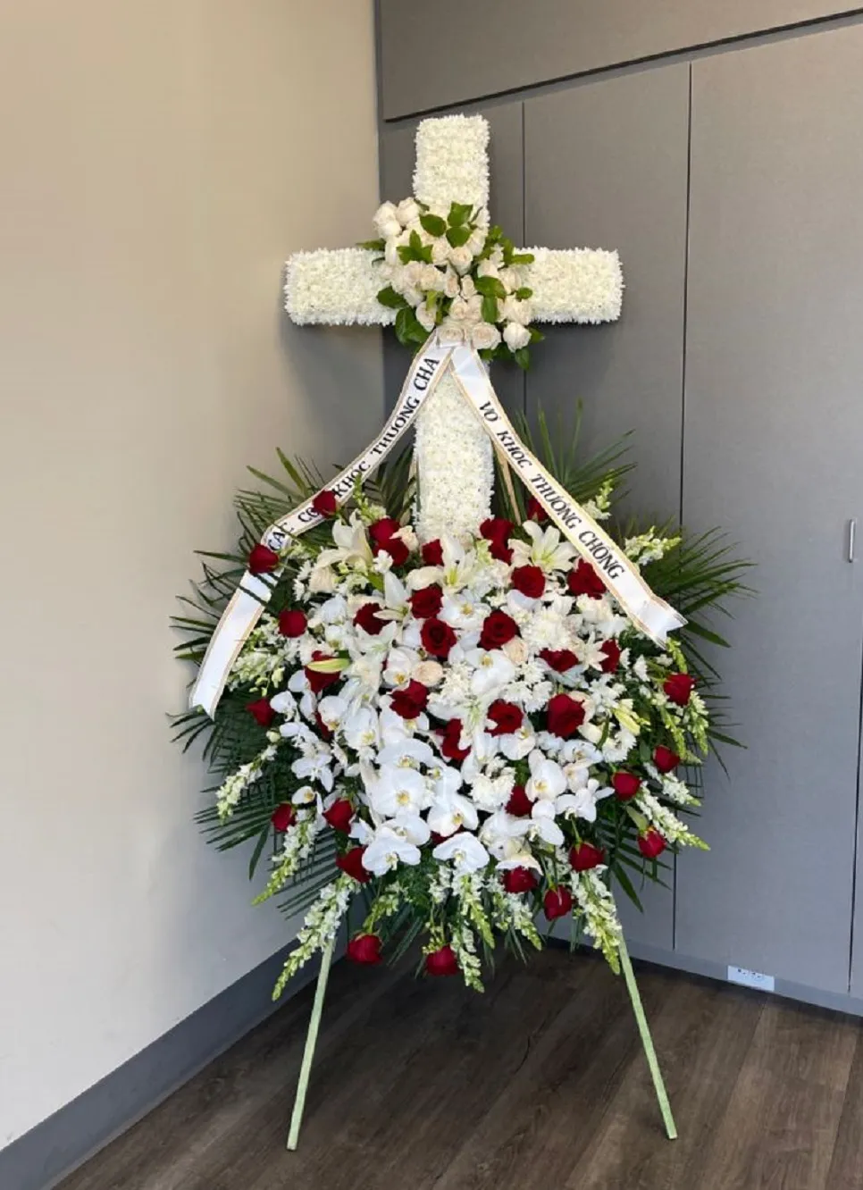 Vòng hoa đám tang đạo Thiên Chúa không chỉ là một kệ hoa chia buồn thông thường mà còn là biểu tượng của đức tin và niềm hy vọng vào sự sống vĩnh hằng. Hình thánh giá kết từ những đóa hoa trắng tinh khôi chính là lời tiễn biệt trang trọng nhất, gửi gắm mong ước linh hồn người đã khuất sớm được về với Chúa và hưởng bình an nơi thiên quốc.